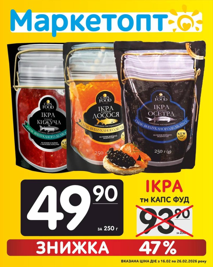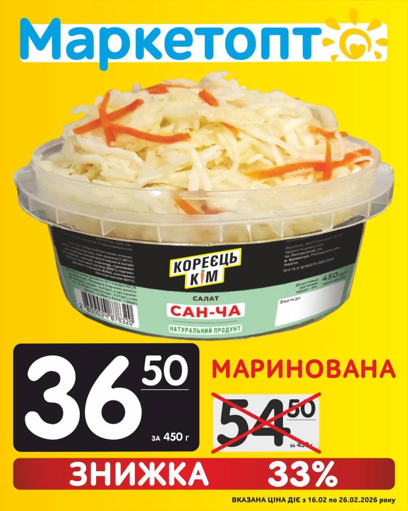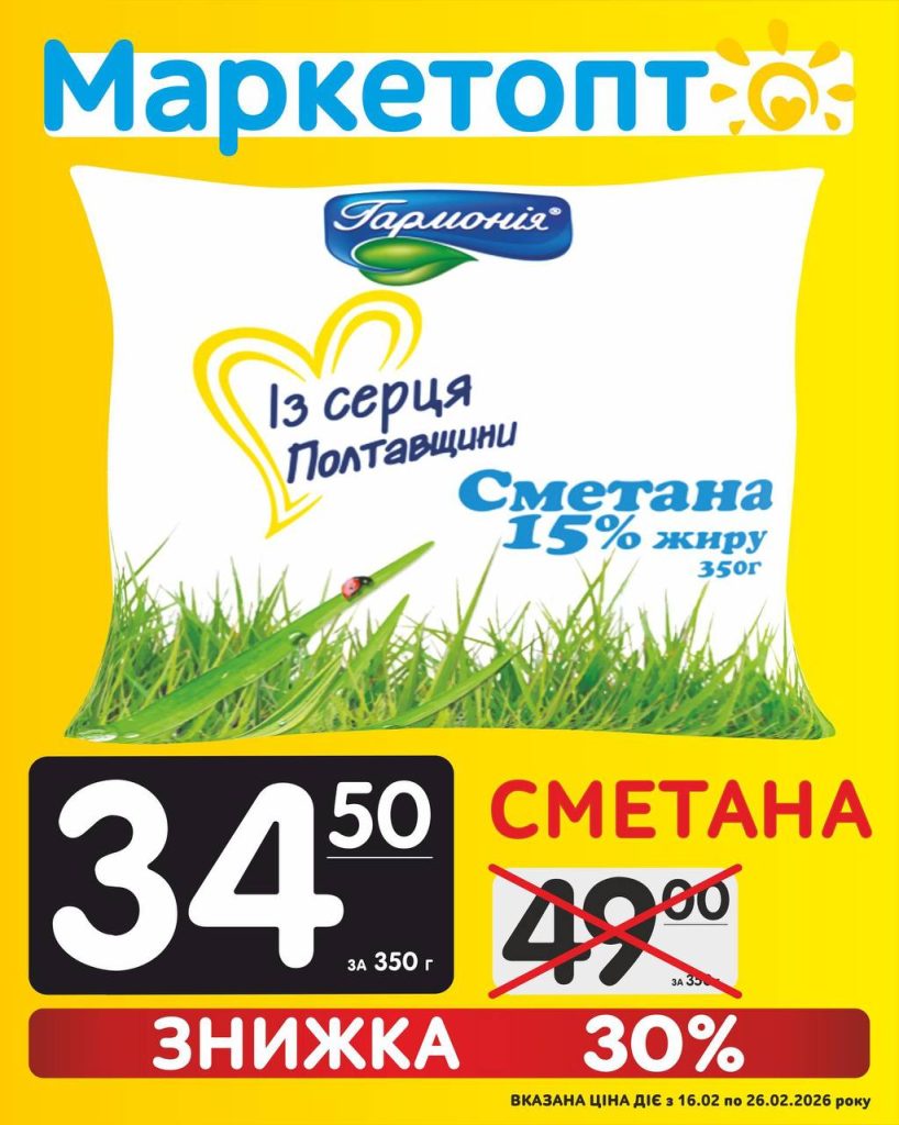 Акційні пропозиції в супермаркетах Маркетопт з 16 по 26 лютого 2026 року.